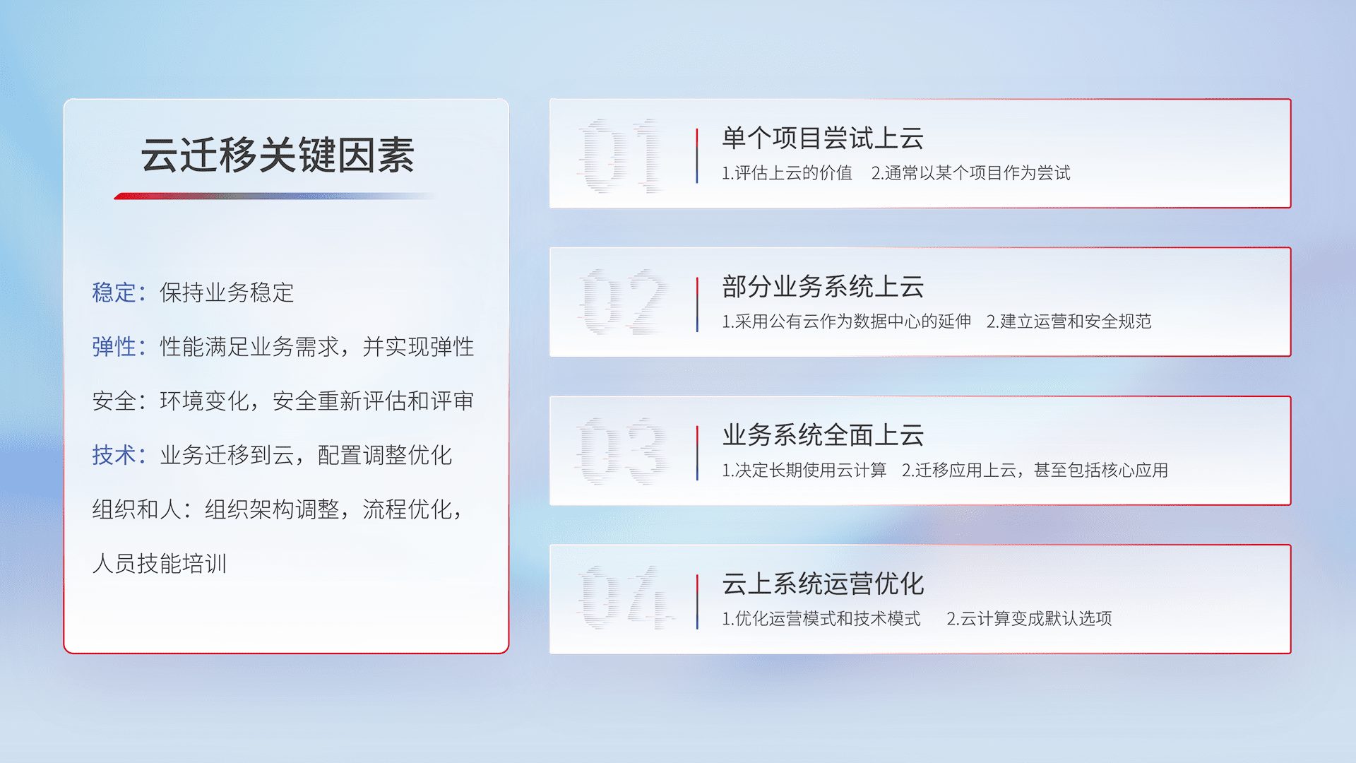 结合实际业务,,,从规划设计、、云平台选型、、、云原生改造、、、、数据迁移、、、、集成交付,,,迁移全过程为客户识别最佳上云路径,,,,做好风险识别管理,,,,设计网络架构、、、身份权限、、、、安全审计合规、、操作审计、、日志审计、、、监控告警策略、、、多站点容灾设计等,,,对云上基础设施进行整体规划,,,提升IT治理水平,,以满足弹性、、、高可用、、、高性能的需求。。
