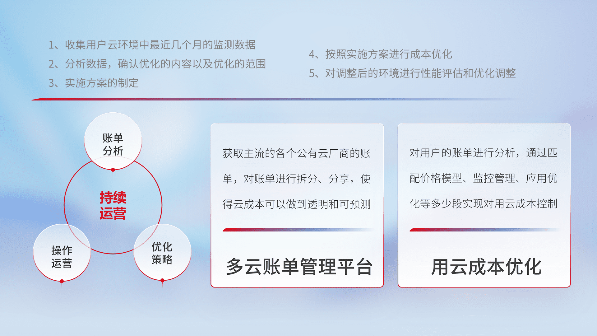 通过多云纳管,,以统一的资源数据模型把客户的云资源进行抽象和封装,,,,进而实现对多云资源的统一操作,,,保障云资源管理的可靠性、、、、稳定性与可用性。。量身定制化运维内容,,,,配置、、、开发运维、、补丁管理、、、备份、、、、监控、、认证和访问管理、、、审计和日常巡检等,,,保障在用云过程中的可靠度,,,稳定度以及高可用率。。。。